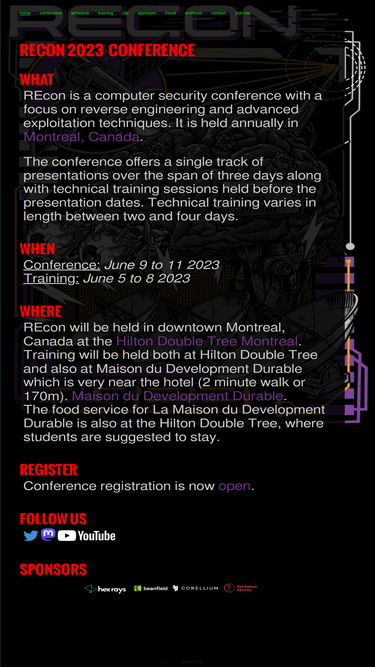 recon is a computer security conference with a focus on reverse engineering and advanced exploitation techniques.