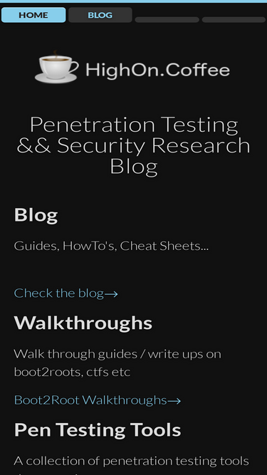 98%welcome to highon.coffee a security research and penetration testing site, containing ctf walkthroughs and useful information.