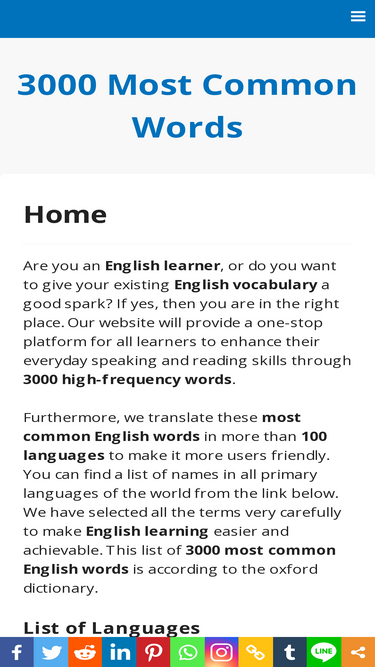 You can learn here 3000 most common spoken English words vocabulary of all languages. You can find a list of words in all the primary languages of the world. This list of words, according to Oxford University.