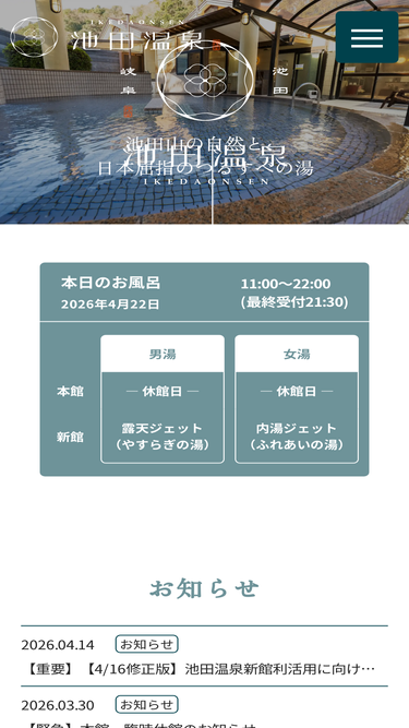 97%「天然温泉 池田温泉」の公式ホームページ。岐阜県池田町にある良質の日帰り天然温泉です。