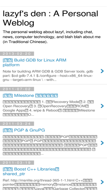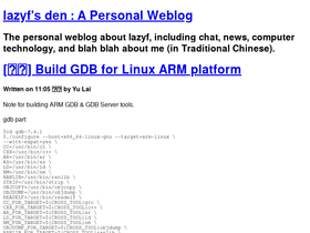 100%The personal weblog about lazyf, including chat, news, computer technology, and blah blah about me (in Traditional Chinese).