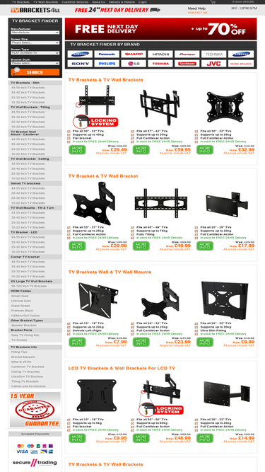 70%online specialist for tv wall brackets. on here you will find any tv wall bracket you want from 43" cantilever arm mounts to a 15" flat mount. free uk delivery on everything.