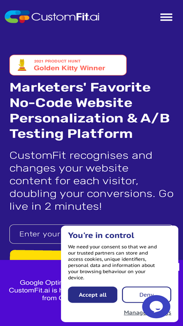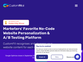 71%Optimize your website with CustomFit.ai's AI-powered no-code A/B testing and website personalization. Boost conversions for D2C brands with real-time dynamic content customization.