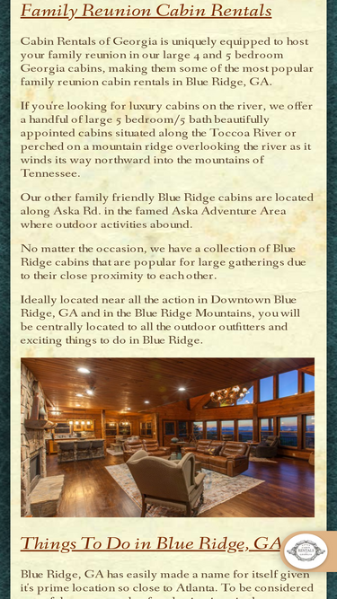 88%blue ridge mountain cabins in north georgia log cabin rentals, lodging in the beautiful north georgia mountains in blue ridge, georgia. come stay with us and experience the magic of the mountains. blue ridge mountain cabins manage a wide array of individually owned two, three and four bedroom vacation cabins, just 90 miles north of atlanta, ga.