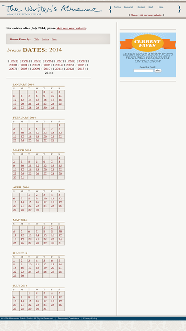 94%american public media's the writer's almanac features garrison keillor recounting the highlights of this day in history and reads a short poem or two.