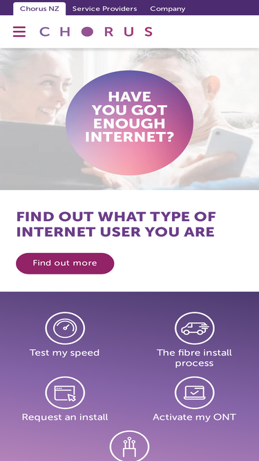 63%New Zealand runs on fibre. Chorus provides wholesale access to our network so that internet providers can sell their broadband plans and packages to you.