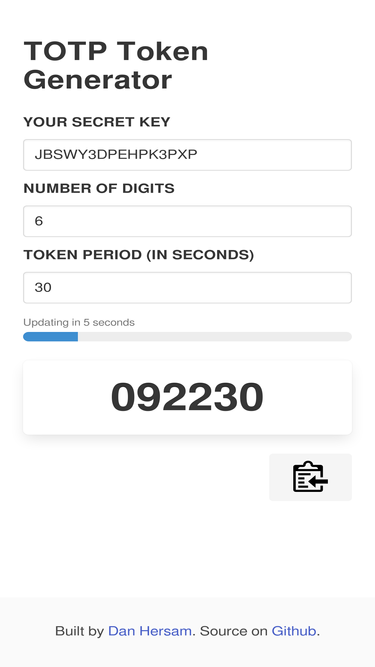 100%totp.app - is a online generator of one-time passwords, based on totp (rfc 6238) algorithm. a web-based analog of the google authenticator mobile application.