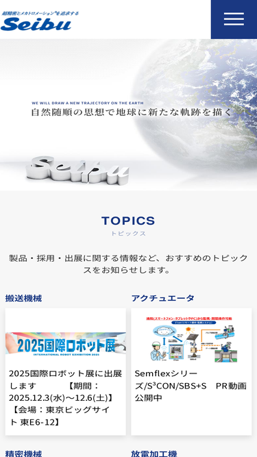 100%私たちは、超精密へのあくなき挑戦と、メカトロと人間の知恵を組み合わせためメカトロメーションの追求で、省力化、自動化、無人化の夢を実現させてきました。さらに、お客様と共に考え(Cooperate)、完璧な商品、システムを提供し(Buildup)、満足していただく(Service)CBSを基本に企業活動を展開しています。技術と品質、そして独自の創造力で広く世界に貢献したい。これが私たちSeibuの熱い思いです。
