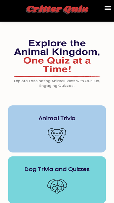 97%Explore the wild world of animals with Critter Quiz! Enjoy fun trivia, engaging quizzes, and educational adventures about your favorite creatures. Perfect for animal lovers of all ages!