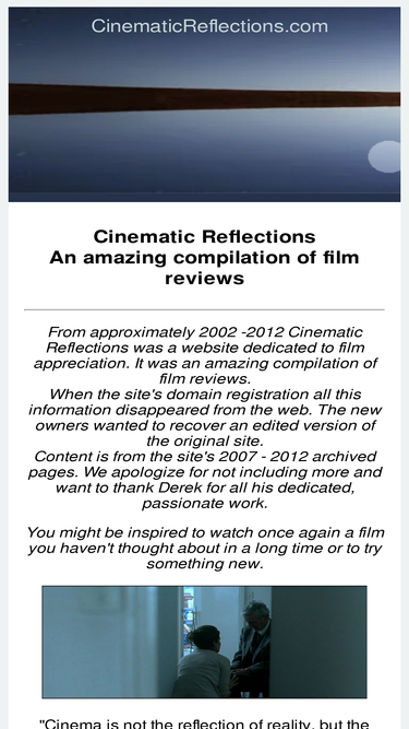 100%from approximately 2002 -2012 cinematic reflections was a website dedicated to film appreciation. it was an amazing compilation of film reviews. content is from the site's 2007 - 2012 archived pages.