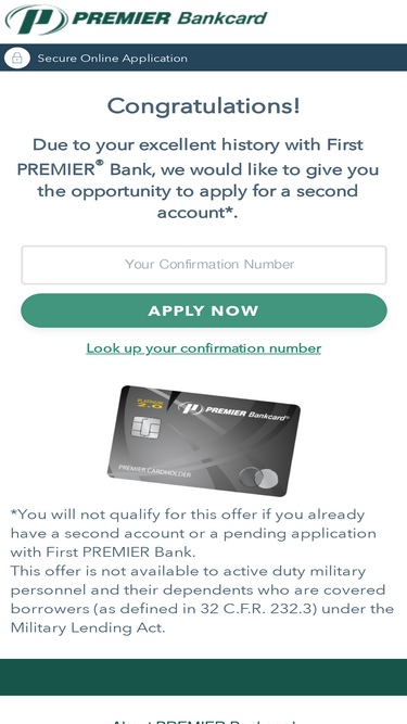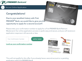 100%enter your first premier bank confirmation number to access the easy online application process and fast 60 second application response. apply now.