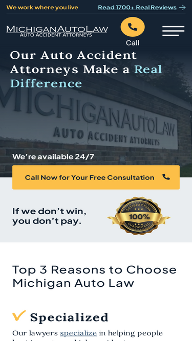 100%Searching for "car accident lawyer near me"? You search ends at Michigan Auto Law. Our auto accident attorneys travel to clients when and where they need us