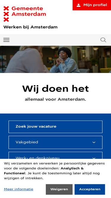 100%Wie worden jouw toekomstige collega's? Hier vertellen zij in hun eigen woorden hoe het is om bij de gemeente te werken. Werken bij de gemeente Amsterdam betekent met duizenden collega’s samenwerken aan een mooie, veilige en milieuvriendelijke stad.