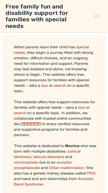 66%When parents learn their child has special needs, they begin a journey filled with strong emotion, difficult choices, and an ongoing need for information and support. Parents may feel isolated and alone, not knowing where to begin. This website offers free support resources for families with special needs - take a tour or search on