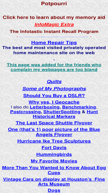 42%home repair tips/advice, memory aid, quilts, photography, pictures, cameras, geocaching, balloons, spam, egg cups