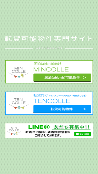 98%民泊可能物件・許可物件を探すなら民泊専門不動産ポータルのミンコレ(mincolle)。独自に不動産オーナーから許可をいただいた物件を紹介。マンション、アパート、戸建てなど、民泊に特化した不動産だから揃えられる物件が多数あります!