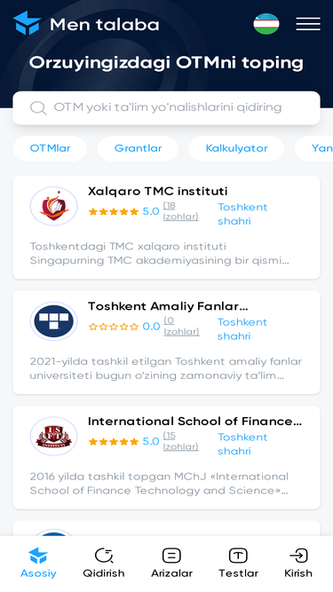 87%Mentalaba bilan Oʻzbekistondagi eng yaxshi universitetlarni oʻrganing. Qabul qilish talablari, dasturlari, o'qish to'lovlari va xalqaro talabalar uchun imkoniyatlar haqida batafsil ma'lumotni toping. Oliy ta'lim yo'lingizni bugun boshlang