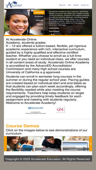 at accelerate academy, students in grades k – 12 are offered a flexible yet rigorous academic experience with rich, interactive curriculum, guided by a highly qualified and effective certified teacher. whether you choose to enroll as a full-time student or you need an individual class, we offer courses in all content areas of study.