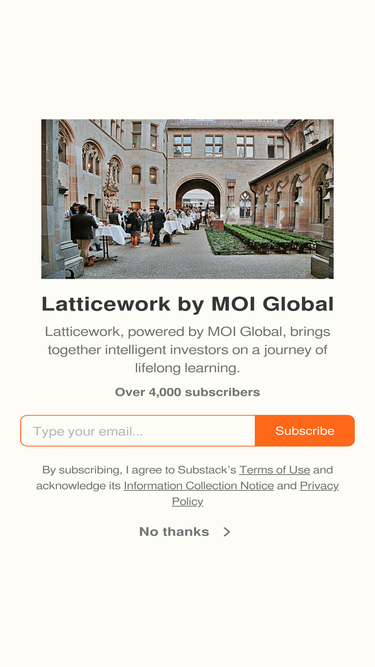96%Latticework, powered by MOI Global, brings together intelligent investors on a journey of lifelong learning. Click to read Latticework by MOI Global, a Substack publication with thousands of subscribers.