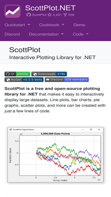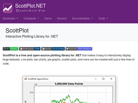 94%ScottPlot is a free and open-source plotting library for .NET that makes it easy to interactively display large datasets. Line plots, bar charts, pie graphs, scatter plots, and more can be created with just a few lines of code.