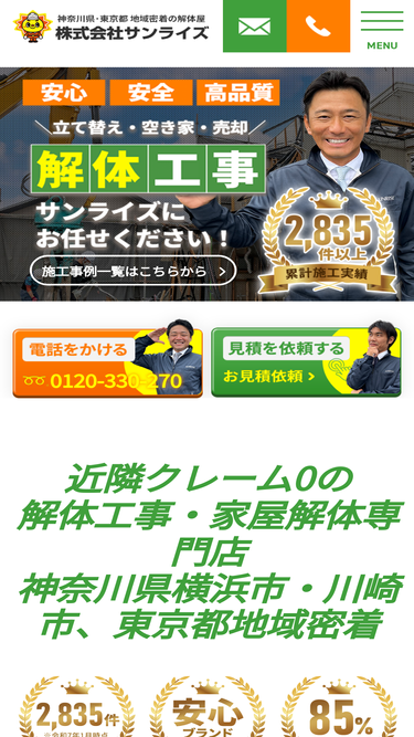 88%株式会社サンライズ 【公式】の採用情報ページです。住宅の建て替えや空き家の解体、土地を含めた売却などをご検討の方は、横浜市・川崎市・東京都を中心に累計2835件以上の家屋解体・解体工事を実施してきた解体屋の安心・安全・高品質のサンライズにお任せください。