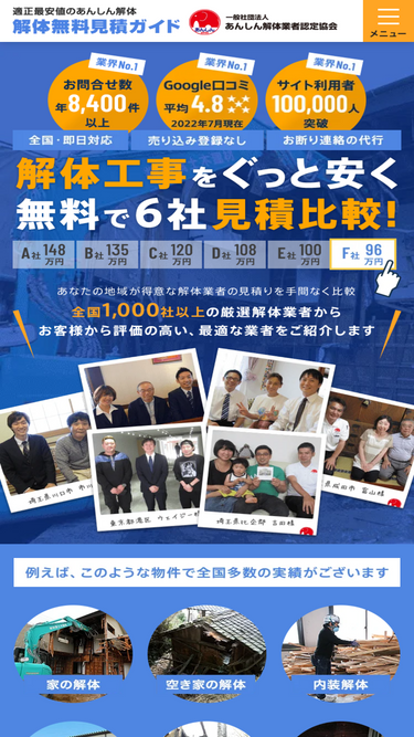 90%【全国対応】解体工事の無料一括見積。あなたの地域が得意な解体業者の見積りを手間なく比較