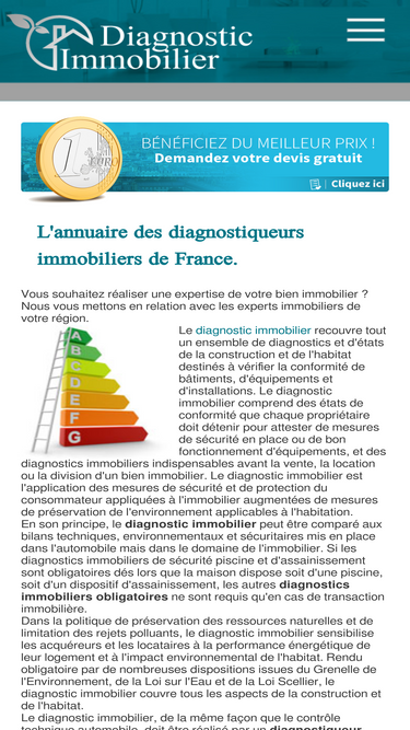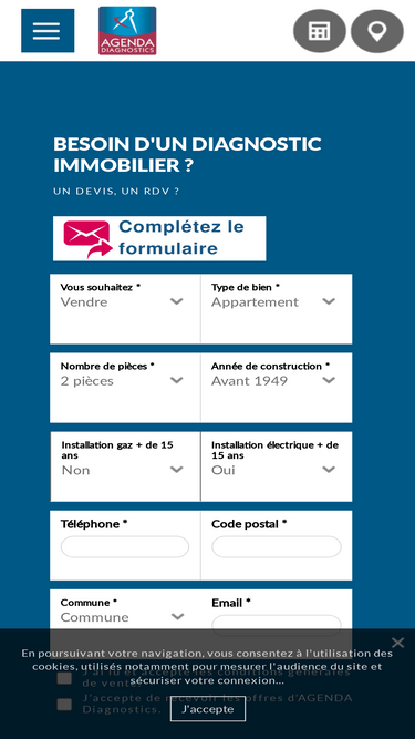 92%Agenda Diagnostics : Votre réseau d'experts en diagnostics immobiliers. Pour vos projets immobiliers, vente ou location, vous avez besoin d'un diagnostic de performance énergétique, amiante, plomb, électrique électricité, d'un audit énergétique ou encore d'un mesurage loi carrez... Information, devis et prise de RDV facile en ligne avec l'un de nos diagnostiqueurs, près de chez vous.