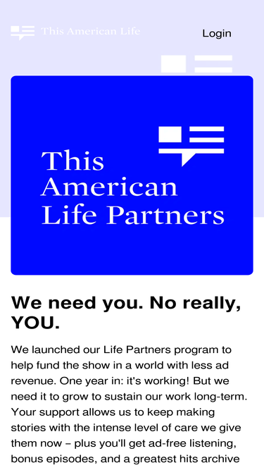 76%We launched our Life Partners program to help fund the show in a world with less ad revenue. One year in: it's working! But we need it to grow to sustain our work long-term. Your support allows us to keep making stories with the intense level of care we give them now – plus you'll get ad-free listening, bonus episodes, and a greatest hits archive with 250+ episodes hand-picked by Ira Glass.