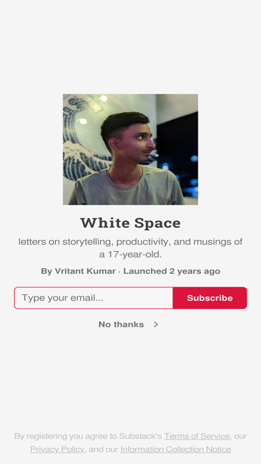 68%an 18-year-old writes about the nuances of digital writing, productivity with minimalism, and 'the fallacy economy' while navigating life and building digital products in his free time. click to read white space, by vritant kumar, a substack publication with hundreds of subscribers.