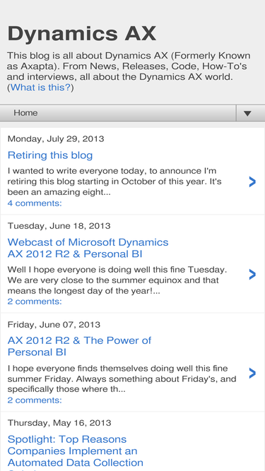95%This blog is all about Dynamics AX (Formerly Known as Axapta). From News, Releases, Code, How-To's and interviews, all about the Dynamics AX world. (What is this?)