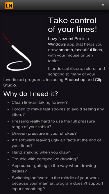 79%lazy nezumi pro is a windows app that helps you draw smooth, beautiful lines with your mouse or pen tablet. it works with photoshop and many other art programs!
