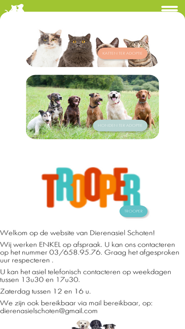 78%HULP NODIG? Meest gestelde vragen Ik wil een hond adopteren Wat leuk! Hier geven we een woordje uitleg over onze adoptieprocedure. Je kan ook alvast kennis maken met onze huidige bewoners. Maar vergeet niet: de uiteindelijk match maken onze medewerkers o.b.v. hun kennis en contact met de dieren. Interesse in een specifieke hond? Vul dan […]