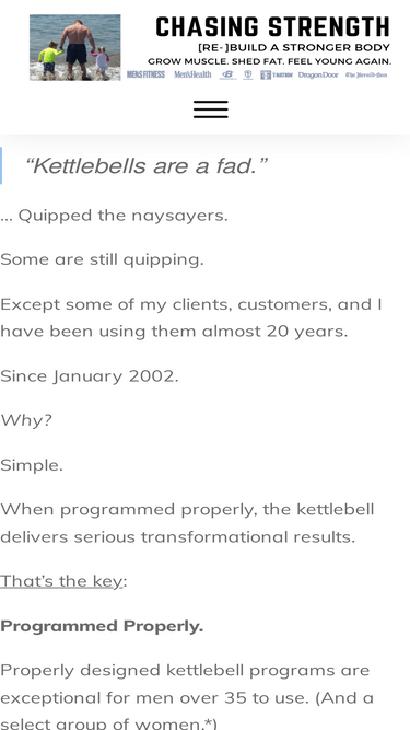 79%“Kettlebells are a fad.” … Quipped the naysayers. Some are still quipping. Except some of my clients, customers, and I have been using them almost 20 years. Since January 2002. Why? Simple. When programmed properly, the kettlebell delivers serious transformational results. That’s the key: Programmed Properly. Properly designed kettlebell programs are exceptional for men over