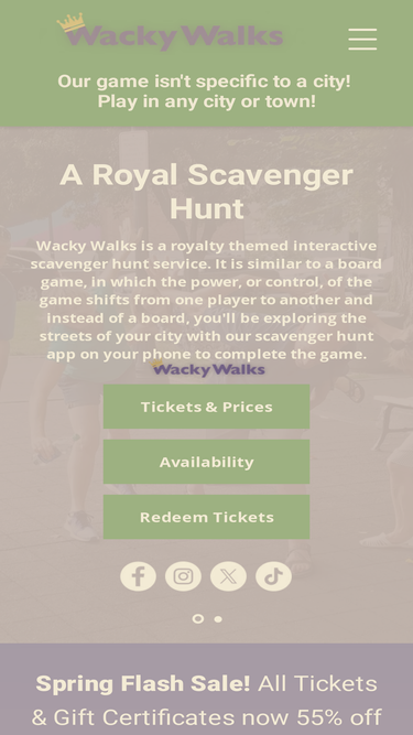 88%Looking for a unique and fun date idea for a new or established relationship? We’re here to help! Wacky Walks will help you create lasting bonds with your date or partner. Wacky Walks is a royalty themed scavenger hunt. It is similar to a board game, in which the power, or control, of the game shif