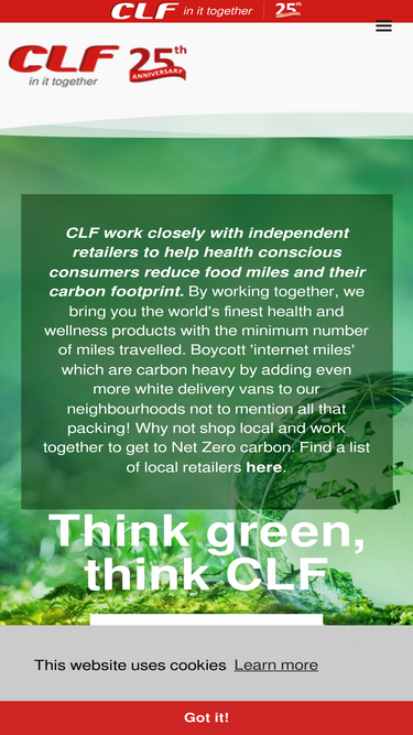 77%clf work closely with both consumers and independent retailers, striving to provide premium health and wellness products in a manner which optimally reduces carbon footprint and food miles. our mission is to promote the vital place of the independent retailer in this environmental goal. by shopping local, not turning to the ease of the computer and incurring yet more 'internet miles', reaching net zero by 2050 isn't so far fetched an ideal for consumers after all.