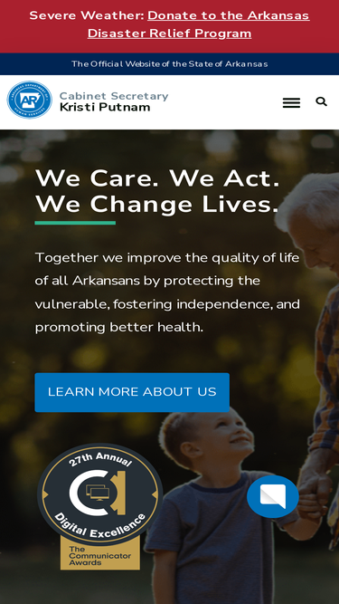 100%We Care. We Act. We Change Lives. Together we improve the quality of life of all Arkansans by protecting the vulnerable, fostering independence, and promoting better health.