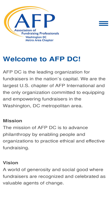 82%the association of fundraising professionals (afp) represents 25,000 members in 165 chapters in the united states, canada, and mexico, working to advance philanthropy through advocacy, research, education, and certification programs.
