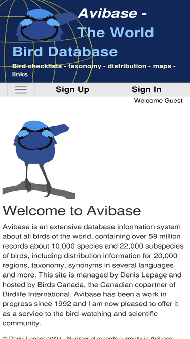 89%avibase is an extensive database information system about all birds of the world, containing over &1 million records about 10,000 species and 22,000 subspecies of birds, including distribution information for 20,000 regions, taxonomy, synonyms in several languages and more.