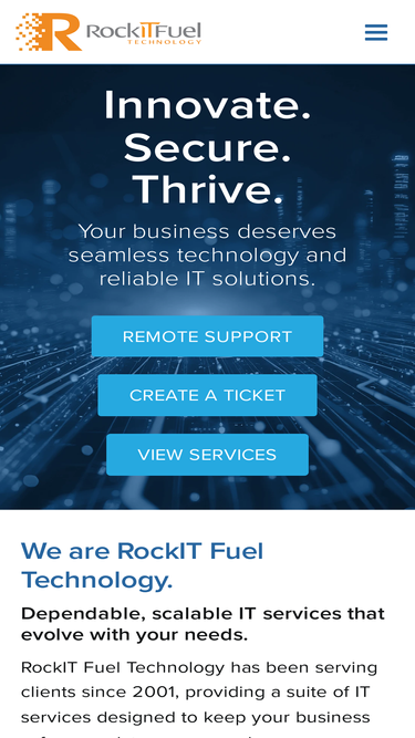 100%Innovate. Secure. Thrive. Your business deserves seamless technology and reliable IT solutions. VIEW SERVICES Innovate. Secure. Thrive. Your business deserves seamless technology and reliable IT solutions. OUR SERVICES We are RockIT Fuel Technology. RockIT Fuel Technology has been serving clients since 2001, providing a suite of services
