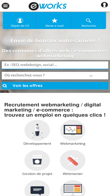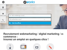 79%E-Works est le site emploi spécialisé dans les profils webmarketing, e-commerce et digital. Découvrez nos offres d'emploi en SEO / SEM, déposez gratuitement votre CV pour être recruté par les meilleurs chasseurs de tête du e-marketing.