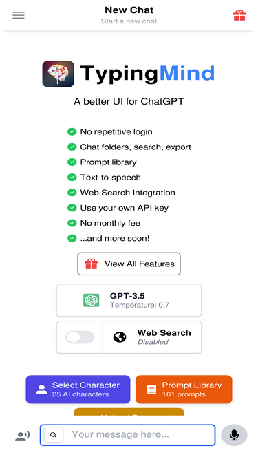 88%Chat with AI using your API keys. Pay only for what you use. GPT-4, Gemini, Claude, and other LLMs supported. The best chat LLM frontend UI for all AI models.