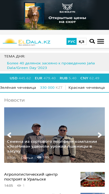 100%ElDala – новости сельского хозяйства Казахстана. ЕлДала - развитие растениеводства и животноводства, расширение рынков сбыта сельхозпродукции, рейтинги агрохолдингов, экспорт мяса и зерна, импорт сельхозтехники и агрохимии, производство продуктов питания, выращивание масличных культур, урожай овощей, расширение орошаемых земель.