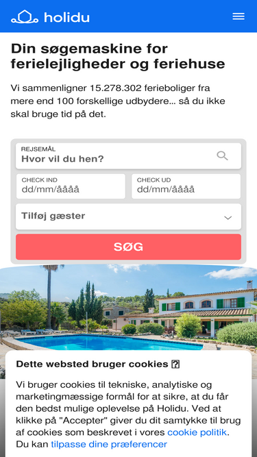 85%Stort udvalg af feriehuse, ferielejligheder og sommerhuse af høj kvalitet ✔ Super indkvartering til den bedste pris, book med sikkerhed ✔ Ferieboliger med pool, havudsigt, børnevenlige eller kæledyrsvenlige ✔ Specialist i de smukkeste ferieregioner i Europa ✔