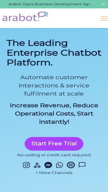 87%عزز تفاعل العملاء وقم بتبسيط العمليات باستخدام منصة arabot متعددة القنوات بدون كود. قم بأتمتة التفاعلات، تحسين تجربة العملاء، وتقليل التكاليف بسهولة. انضم إلى أكثر من 20 مليون مستخدم واستمتع بمعدل أتمتة يصل إلى 60%. اشترك مجانًا اليوم!