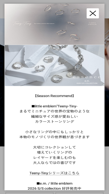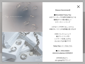 96%ジュエリーを中心に展開するブランドe.m.( イー・エム) は、“みんながよろこぶモノづくり ありそでなさそなモノづくり ”をコンセプトに、1996 年に設立。カジュアルなシルバーからゴールドのファインジュエリー、ブライダルリングまで幅広いジュエリーを展開します。
