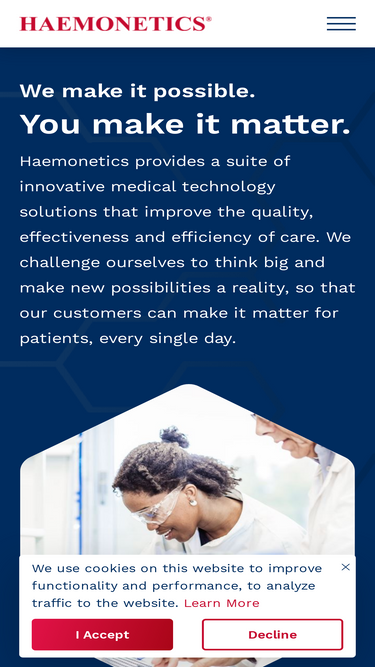 90%Haemonetics provides a suite of innovative medical technology solutions that improve the quality, effectiveness and efficiency of care. We challenge ourselves to think big and make new possibilities a reality, so that our customers can make it matter for patients, every single day..