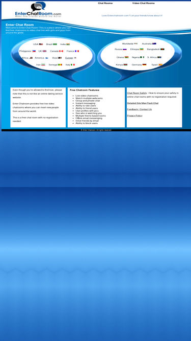 90%free chat room with no registration required with country based online chatrooms where you can video chat live with people around the globe.