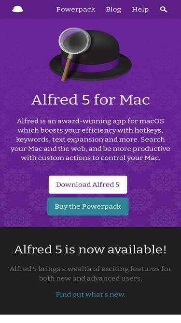 76%alfred is a productivity application for macos, which boosts your efficiency with hotkeys, keywords and text expansion. search your mac and the web, and control your mac using custom actions with the powerpack.