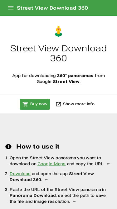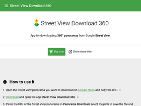 92%free tool for downloading 360° panoramas from google street view. available for windows, mac os, and linux.