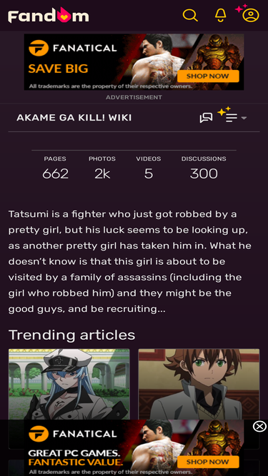 100%Akame ga Kill! (アカメが斬る!, Akame ga Kiru!, literally meaning "Akame Slashes!") is a Japanese shōnen manga series by Takahiro with illustrations by Tetsuya Tashiro. The main series was followed by an anime adaption and a prequel manga. A continuation of the manga series, Hinowa ga Yuku! was serialized from 2017 to 2022. Tatsumi is a fighter who, accompanied by his two childhood friends Sayo and Ieyasu, sets off to the Capital in search of a way to make money to assist his poverty-stricken...